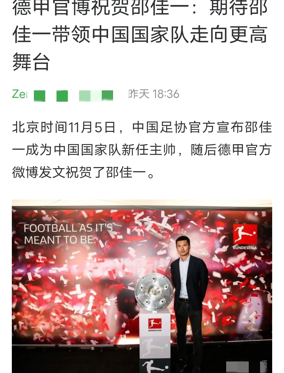 在得知邵佳一出任中国国家队主教练以后,德甲职业足球联盟和德国足协发文表示祝贺,他们在发文时表示:邵佳一在球员时期,曾效力过德甲慕尼黑1860、德甲科特布斯、德乙杜伊斯堡、3支德国球队。他在德国踢球时间长达9年,他是一位杰出足球运动员并入选德国足球名人堂。如今,邵佳一出任中国国家队主教练,这也是德国足球荣耀。在邵佳一执教中国队期间,如有必要德国足坛各界将提供一切支持,希望邵佳一带领中国队走向更高舞台,预祝他执教中国队一切顺利。