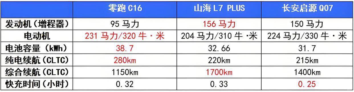 在各平台网站和官网我们可以看见,零跑C16售价15.18-18.98万元,捷途山海L7 PLUS售价11.99-16.59万元,长安启源Q07售价12.98-17.68万元。我们分别挑选了售价16.88万元的零跑C16 增程 280激光雷达智尊版 5座、售价16.59万元的捷途山海L7 PLUS 220km 旗舰版和售价16.68万元的长安启源Q07 215激光旗舰型来进行横向对比,通过尺寸、动力、续航、辅助驾驶、配置、功能和空间等方面来看一下谁的产品力更加出色。