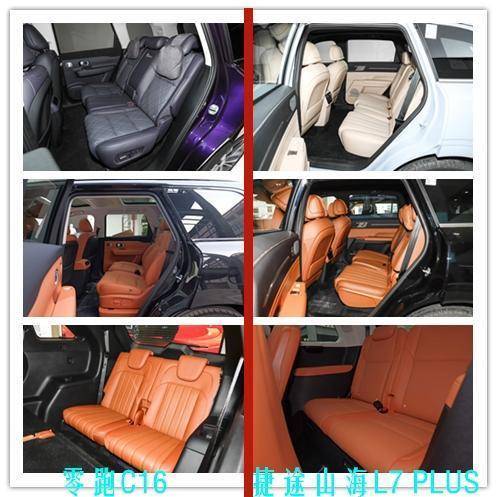 我们具体来对比更加实用的布局,也就是对比零跑C16的6座车型和捷途山海L7 PLUS的7座车型。就配置方面来说,我个人觉得零跑C16的整体表现要更好一些,而且它的一二排座椅都支持加热/通风/按摩功能,捷途山海L7 PLUS仅前排座椅支持加热/通风/按摩功能,在差不多的价格内性价比一下子就下去了。座椅功能方面,六座的零跑C16后排支持自动开合,可以左右移动,给后排乘员拓出一条通道,更加方便后排上下车,这么相比,零跑C16给的配置真的很多。